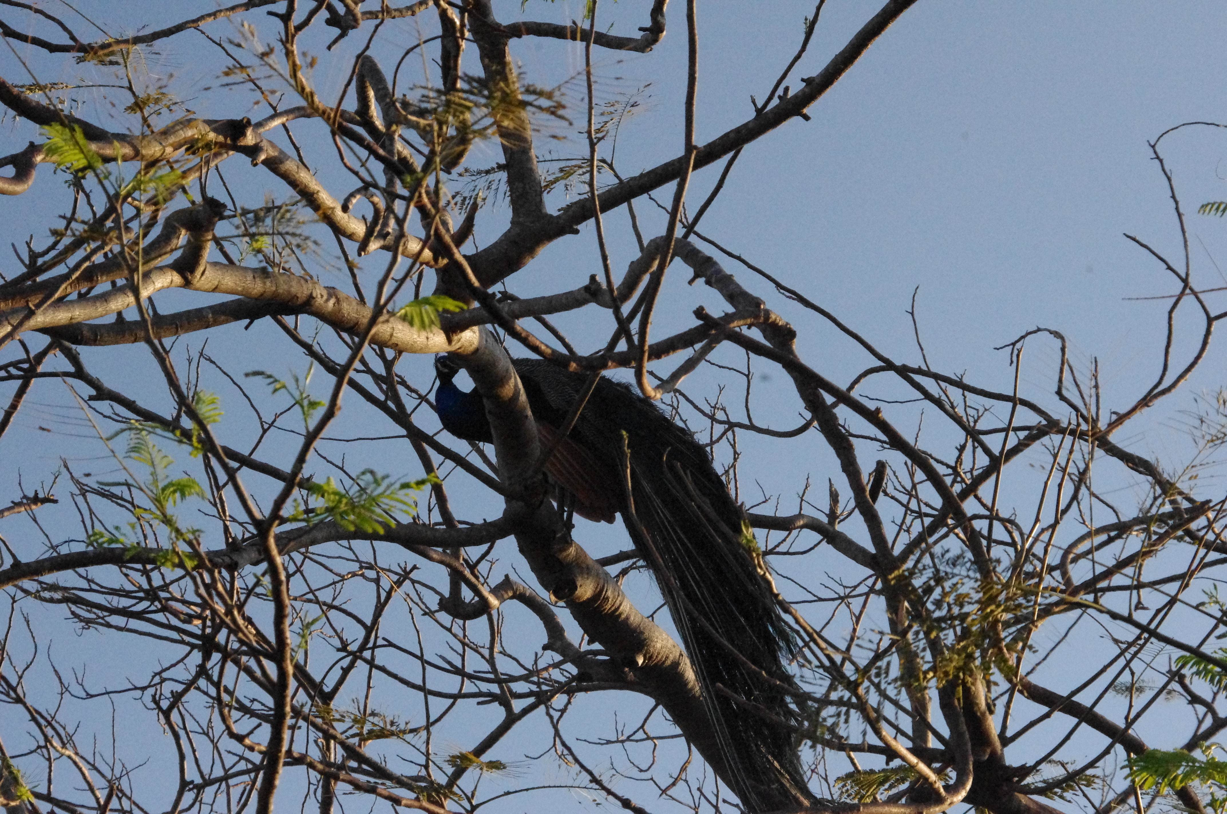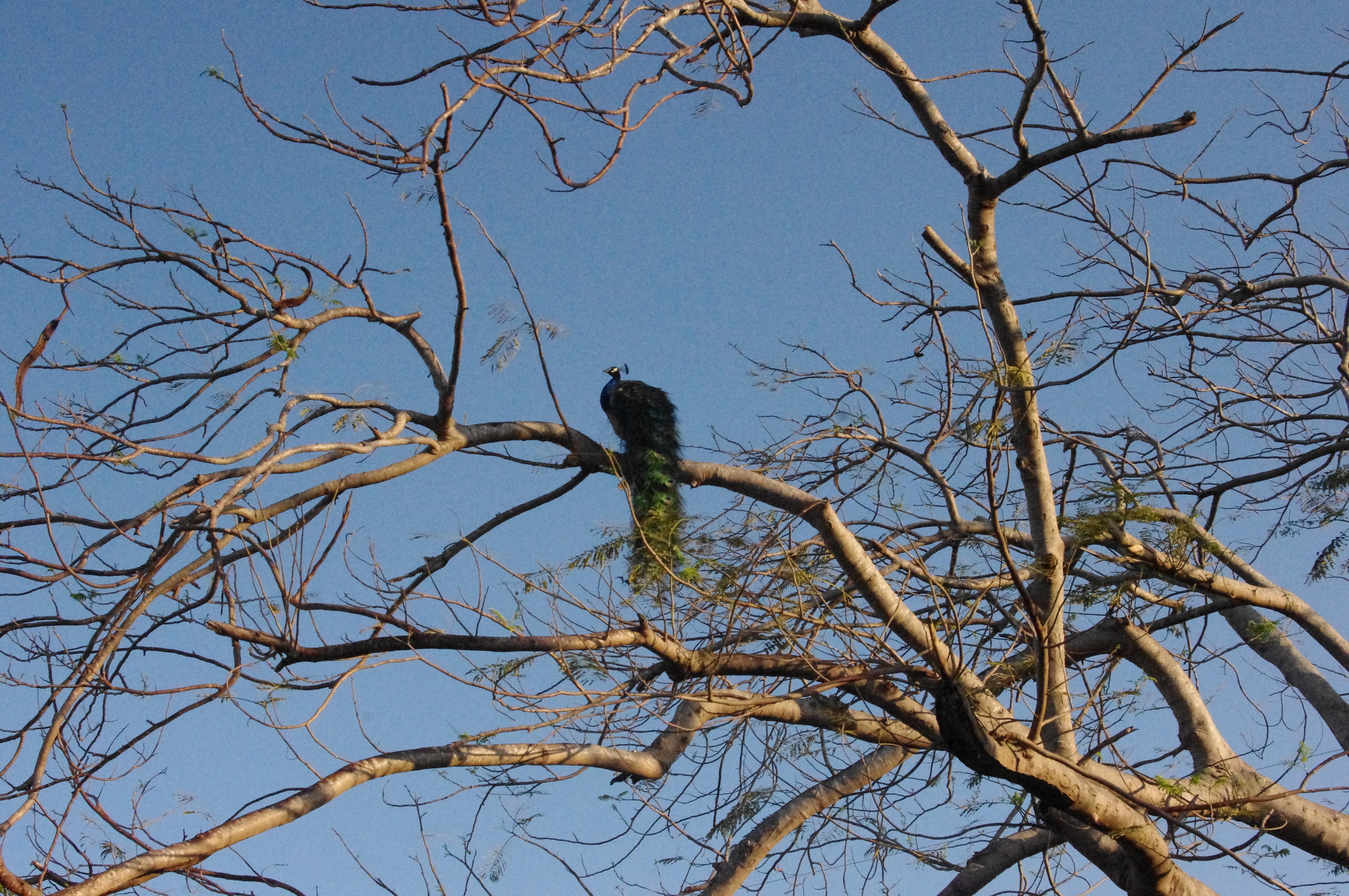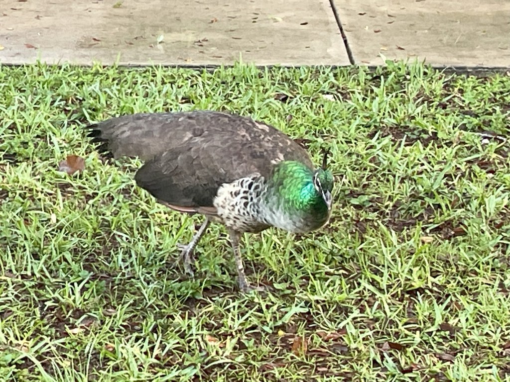 Which is when I learned that peafowls like to sleep perched high up and will do so even in urban settings if there’s a convenient tree. I also learned that they howl or screech whenever something out of the norm occurs in their environment. Peacocks (as opposed to the female peahens) also make a distinctive hoot when they mate, which happens from March through September.