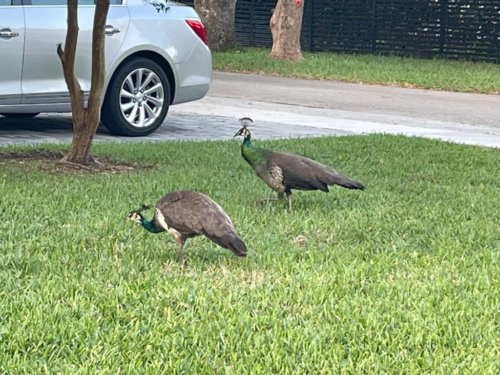 So it turned out our interloper was a peacock, but we never figured out if it was disturbed (which would not surprise me one bit in this city) or trying to attract a mate. Now for the funny part…knowing next to nothing about peafowls at the time, I thought it was stuck and that’s why it was making those noises. So I called a local wildlife removal service to come help. The guy asked me some questions on the phone and immediately knew what was going on. And that’s how I learned what little I know about peafowls. He’s probably still laughing.